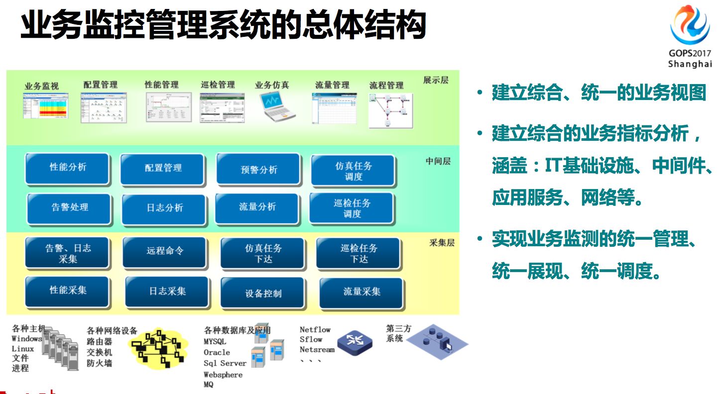 采集層需要(yào)把不(bù)同數(shù)據源的(de)數(shù)據采集過來(lái),中間(jiān)層做(zuò)一(yī)些(xiē)性≈能(néng)分(fēn)析,配置管理(lǐ)和(hé)預警分(fēn)析、告警處理(lǐ)。展示層将分(fēn)析的(de)結果展示出來φ(lái),也(yě)就(jiù)是(shì)各種圖表,建立綜合的(de)業(yè)務指标分(fēn)析,方便根因定位和(hé)解決問(wèn)題。