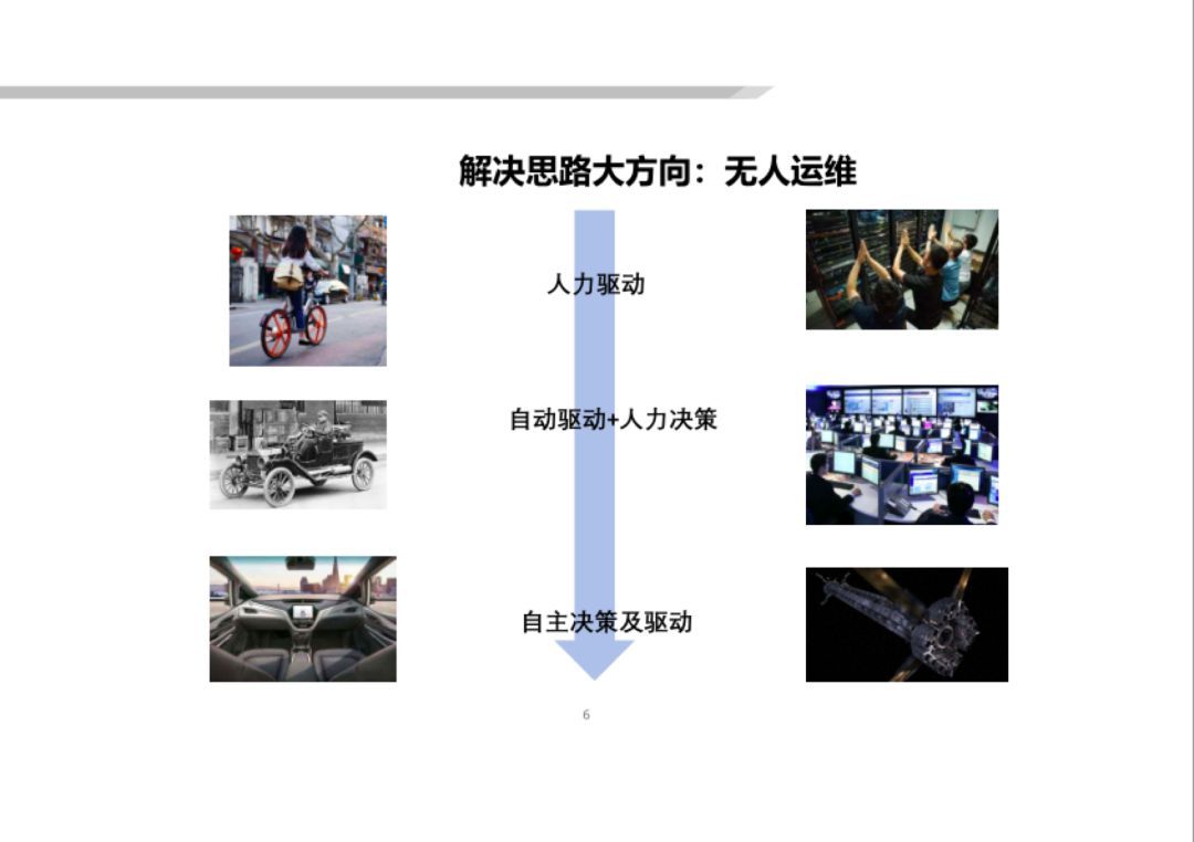 而我們解決上(shàng)述核心矛盾的(de)思路(lù)就(jiù)是(shì)逐漸減少(shǎo)人(rén)力在運維決策中所占的(de)比例,逐漸增加人(rén)工(gōng&)智能(néng)在運維決策中的(de)比例,最終實現(xiàn)無人(rén)運維 (見(jiàn)下(xià)圖)。