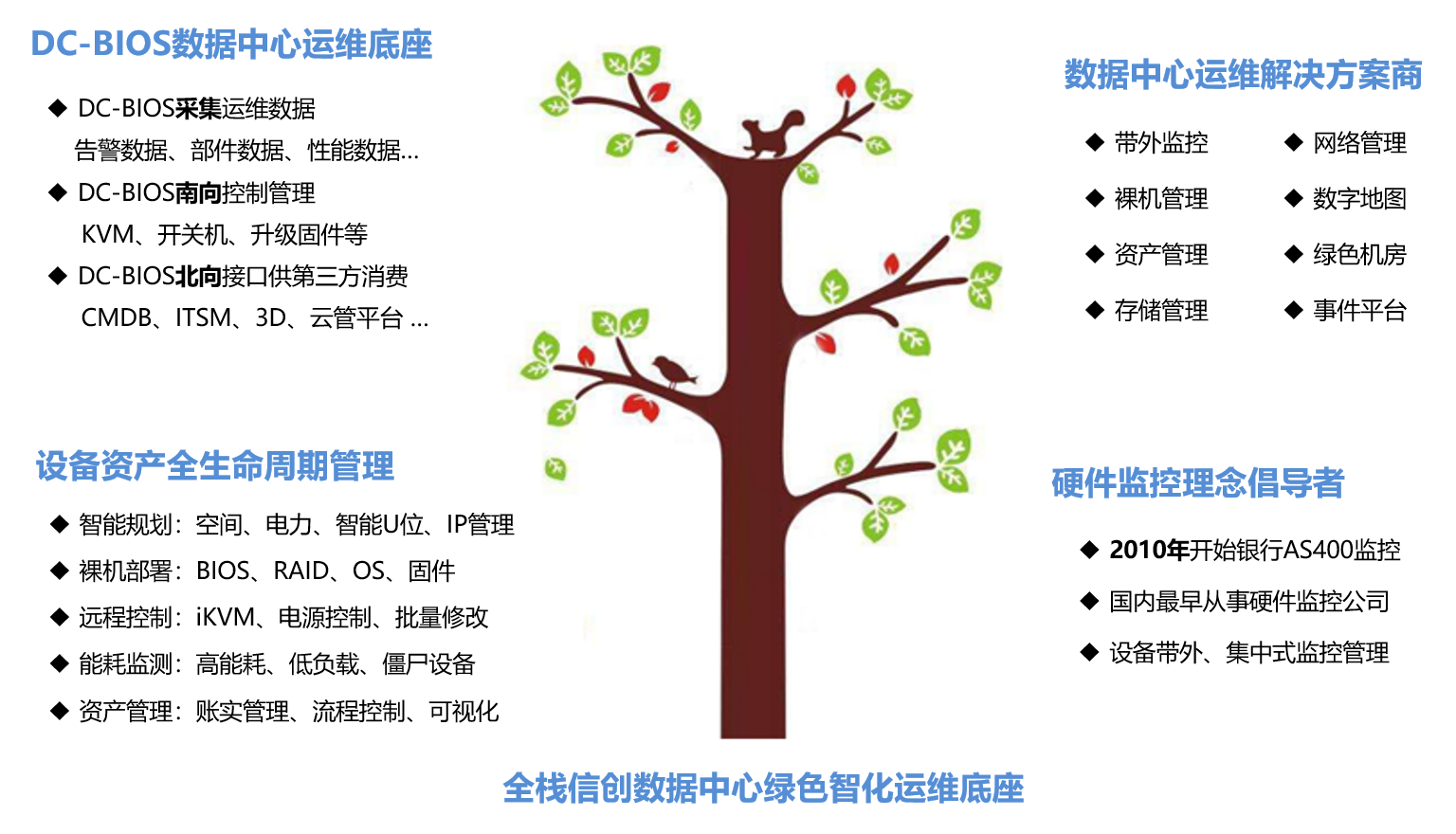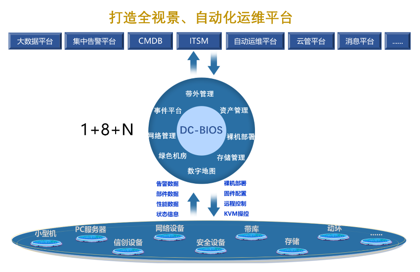 合明(míng)軟件(jiàn)憑借十數(shù)年(nián)的(de)行(xíng)業(yè)經驗,持續深度耕耘,創造性提出數(shù)據中心運維底座DC-BIOS藍(lán)圖,提供切實可(kě)行(xíng)1+8+N的(de)解決方案。