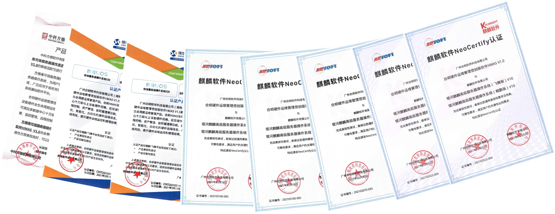 此外(wài),HMAS V1.0還(hái)全面适配國(guó)産化(huà)軟硬件(jiàn)産品,支持鲲鵬、飛(fēi)騰、龍芯、兆芯、海(hǎi)光(guāng)♥等CPU平台,并先後與麒麟軟件(jiàn)、統信UOS、中科(kē)方德、人(rén)大(dà)金(jīn)倉、瀚高(gāo)、華為(wèi)、浪潮、中科(kē)曙光(guāng)¶、長(cháng)城(chéng)、雲宏等十多(duō)家(jiā)國(guó)內(nèi)知(zhī)名IT服務商成功進行(xíng)了(le)多(duō)類别、多(duō)層次的(d>e)産品兼容測試認證工(gōng)作(zuò),獲得(de)了(le)20張以上(shàng)的(d&e)産品兼容互認證證書(shū),完成了(le)涵蓋芯片、國(guó)産操作(zuò)系統、數(shù)據庫、服務器(qì)以及虛拟化(huà)雲平台等廣泛信®創生(shēng)态産品兼容性認證測試。