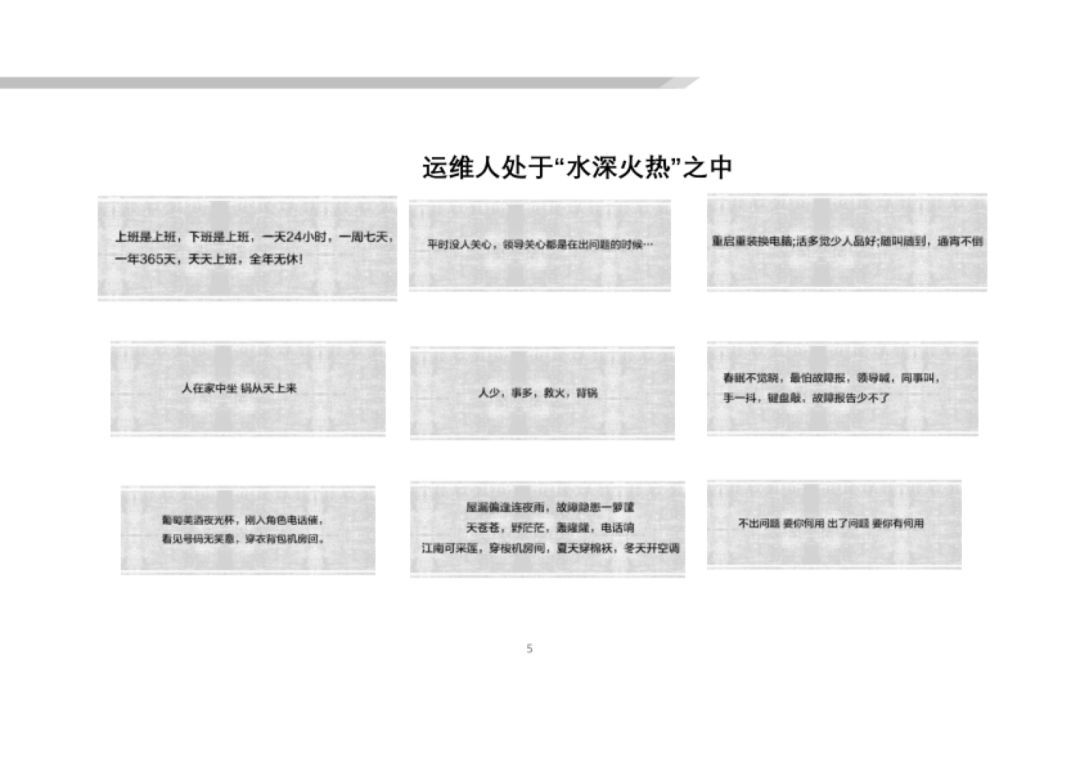 這(zhè)導緻我們的(de)運維人(rén)員(yuán)的(de)工(gōng)作(zuò)生(shēng)活可(kě)以說(shuō)是(shì)處于δ水(shuǐ)深火(huǒ)熱(rè)之中, “人(rén)少(shǎo)、事(shì)多(duō),救火(huǒ)、背鍋”,7*24小(xiǎo)時(shí)時(shí)刻準備救火(huǒ)。