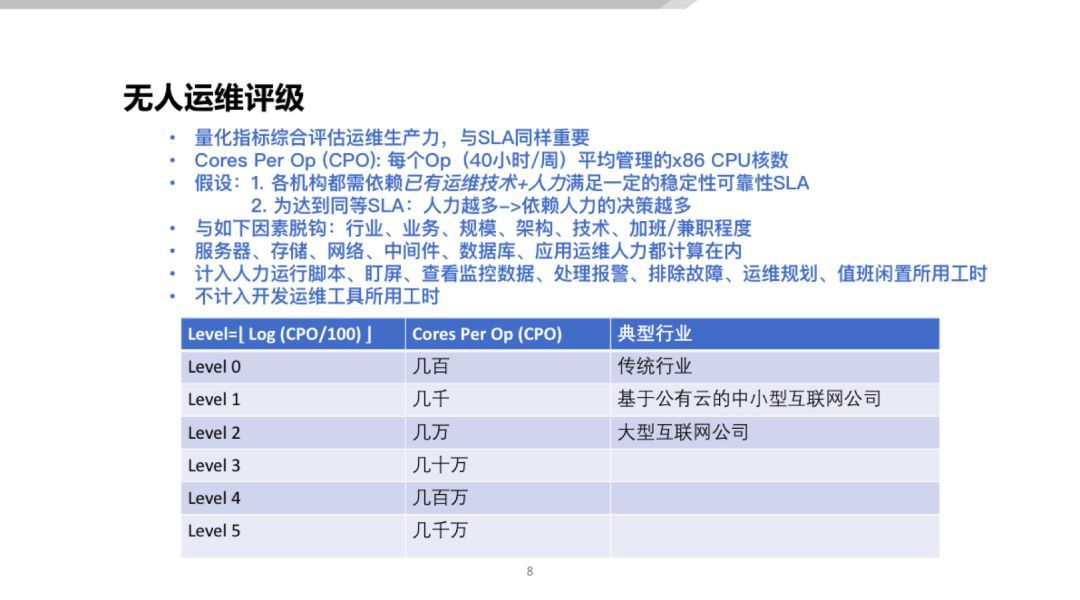 基于如(rú)上(shàng)考慮,我們提出的(de)指标是(shì)Coresper Op (CPO), 即每個(gè)運維人(rén)員(yuán)OP(每周平均工(gōng)作(zuò)40小(xiǎo)時(shí))平均管理(lǐ)的(de)X86 CPU核數(shù),而評級可(kě)以對(duì)照(zhào)下(xià)表直接換算(suàn)。