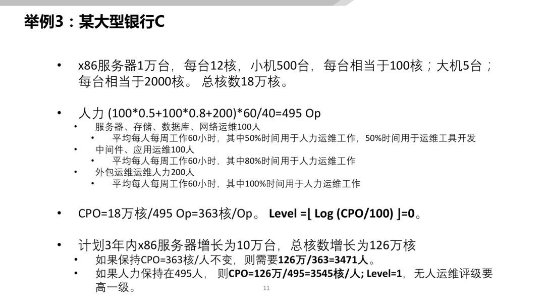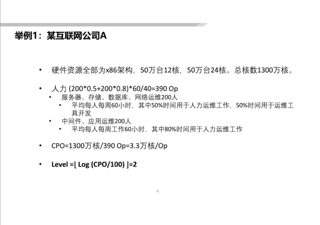 某大(dà)型銀(yín)行(xíng)C的(de)CPU核數(shù)核算(suàn)下(xià)來(lái)有(yǒu)18萬核,各種運維人(rén)力(其中包括外(wài)包運維人(rén)力200人(rén))核算(suàn)下(xià)來(lái)有(yǒu)495 Op。CPO為(wèi)363,相(xiàng)當于Level 0。水(shuǐ)平遠(yuǎn)低(dī)于互聯網公司A、B。