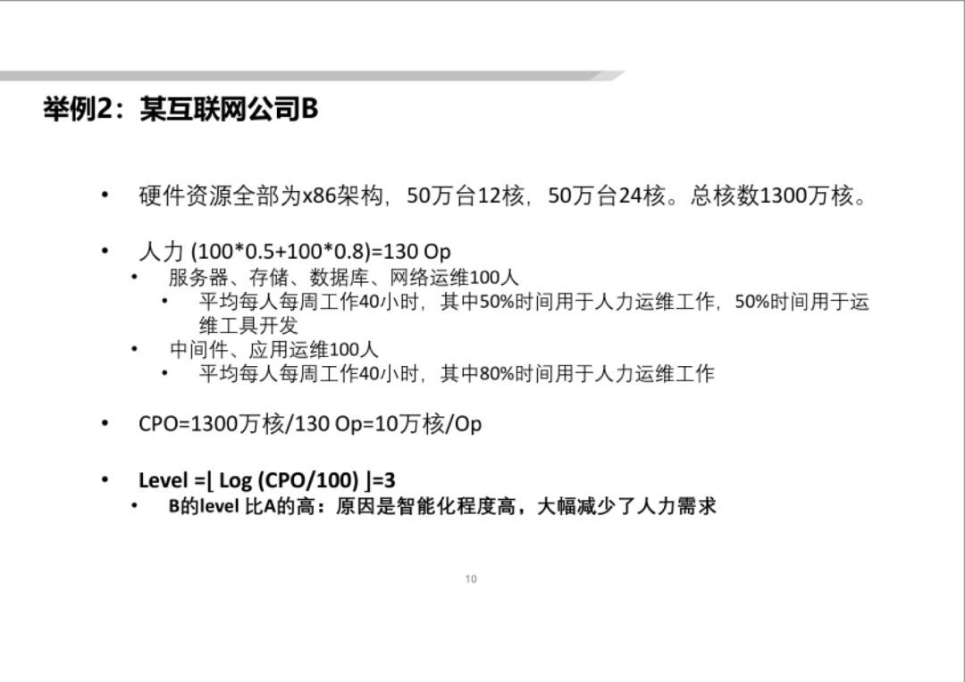 互聯網公司B(見(jiàn)下(xià)圖)運維水(shuǐ)準要(yào)比A高(gāo)一(yī)些(xiē): 總核數(shù)同樣是(shì)1300萬,但(dàn)是(shì)總人(rén)力核算(suàn)下(xià)來(lái)隻有(yǒu)130 Op,用(yòng)相(xiàng)同方法計(jì)算(suàn)下(xià)來(lái)是(shì)Level 3, 比A高(gāo)一(yī)級,表示其智能(néng)化(huà)程度更高(gāo)。