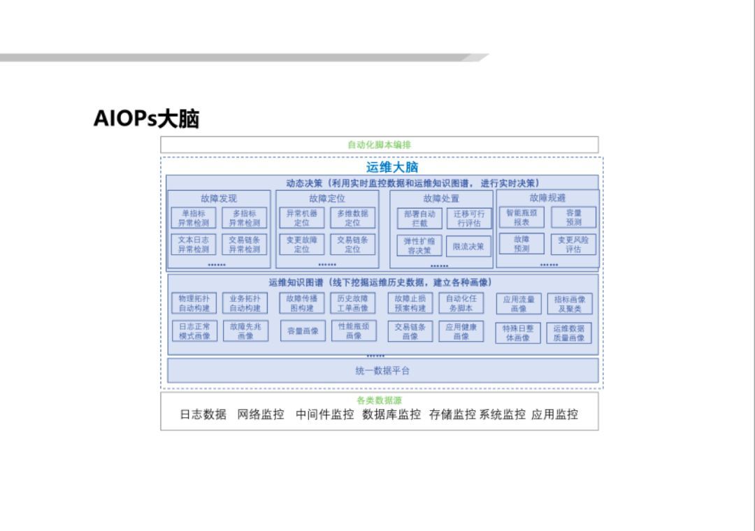 中間(jiān)部分(fēn)是(shì)“大(dà)腦(nǎo)”,就(jiù)是(shì)AIOps,它以眼睛感知(zhī)到(dào)的(de)數(shù)據作(zuò)為(wèi)輸入,做(zuò)出實時(shí)的λ(de)運維決策,從(cóng)而驅動“手”執行(xíng)一(yī)些(xiē)自(zì)動化(huà)的(de)操作(zuò)。