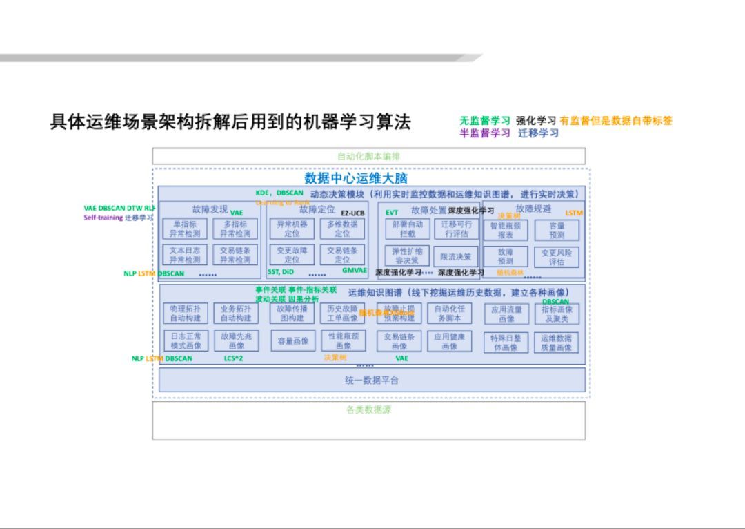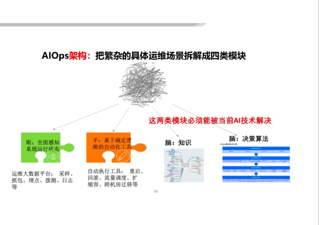 可(kě)以看(kàn)到(dào)不(bù)同的(de)模塊采用(yòng)的(de)通(tōng)用(yòng)AI算(suàn)法差異非常大(dà),有(yǒu)些(xiē)模塊還(hái)需要(yào)若幹通(tōng)用(yòng)AI算(suàn)法的(de)組合才能(néng)良好(hǎo)解決。這(zhè)張圖充分(fēn)說(shuō)明(míng)了(le)AIOps的(de)架構挑戰。