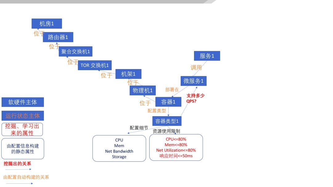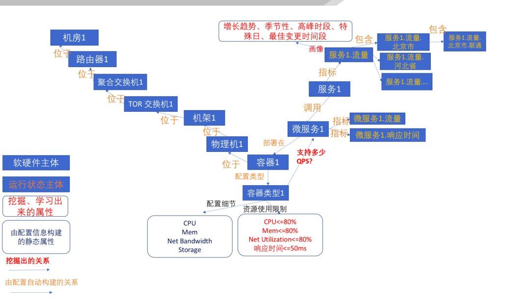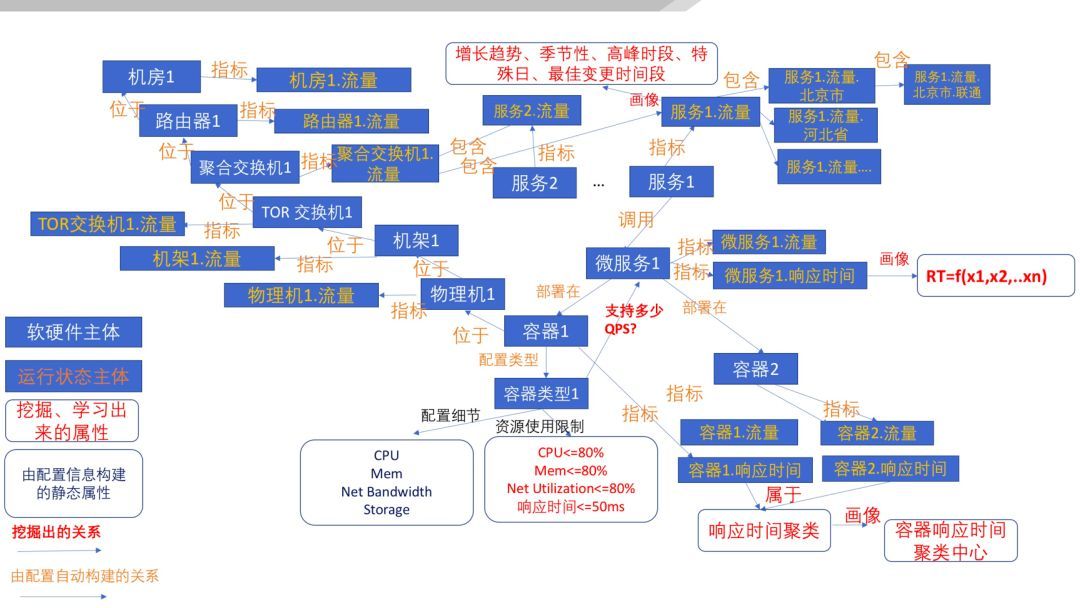這(zhè)種關系也(yě)是(shì)通(tōng)過确定邏輯基于配置信息自(zì)動構建的(de)(橙色的(de)邊屬性)。那(nà)麽,容器©(qì)類型1可(kě)以支持微(wēi)服務1每秒(miǎo)鐘(zhōng)多(duō)少(shǎo)次的(de)交易呢(ne)(容器(qì)類型1與微(wēi)服務1之間(jiān)的(de)邊的(de)紅(hóng)色屬性)?這(zhè)個(gè)屬性需要(yào)通(tōng)過曆史數(shù)據、壓測數(shù)據✔構建動态的(de)畫(huà)像。