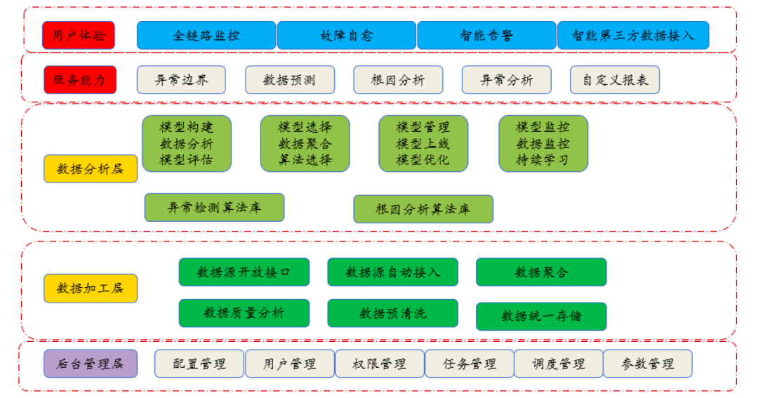 在基于面向終态的(de)監控平台設計(jì)中,平台應有(yǒu)如(rú)下(xià)分(fēn)層。①用(yòng)戶體(tǐ)驗層;②服務能(néng)力層;③數(shù)據分(fēn)析層;④數(shù)據加工(gōng)層;⑤後台管理(lǐ)層。
